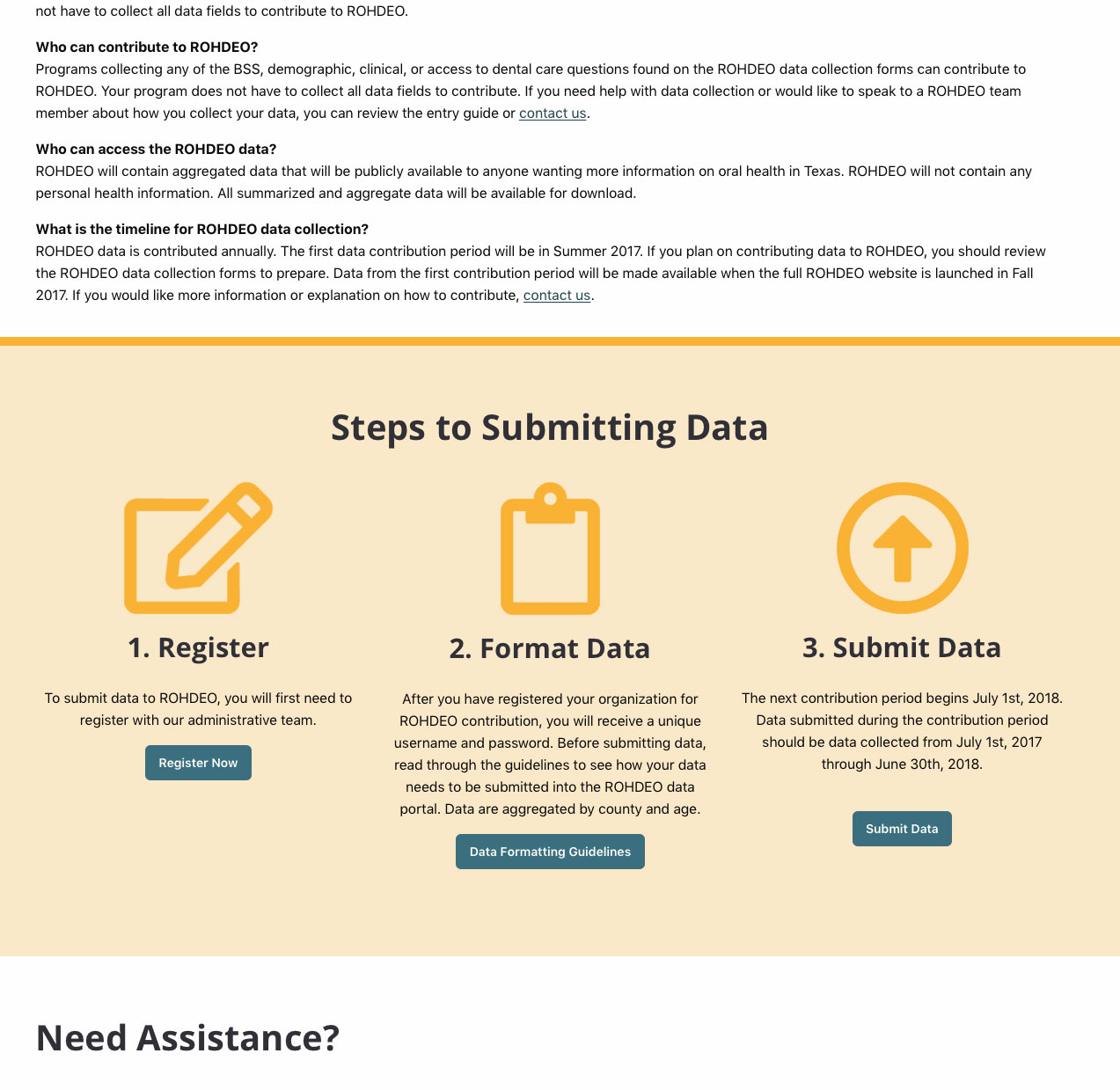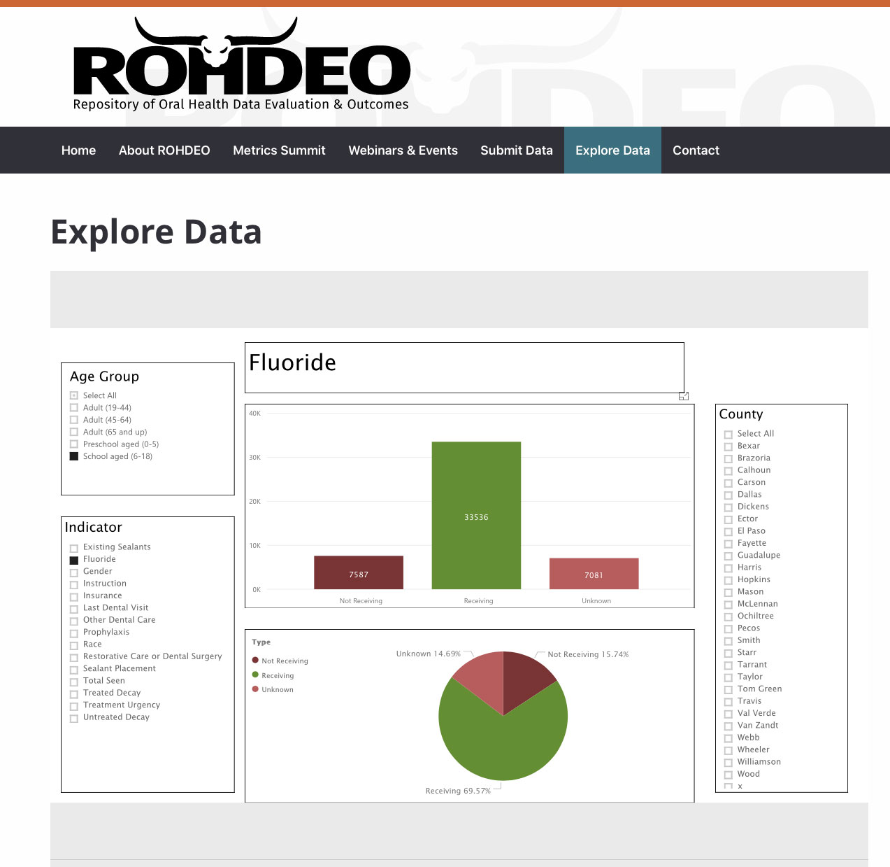 The Texas Repository of Oral Health Data for Evaluation and Outcomes (ROHDEO) is a statewide database of oral health indicators contributed by community dental programs in Texas. I took existing artwork (the ROHDEO logo) and created a new design system for the website. In addition, I architected the site's revised structure to make it easier to navigate and to get to the available data.